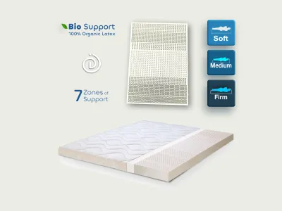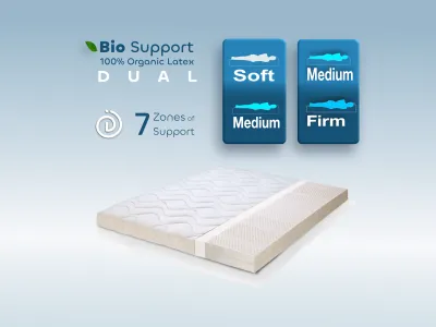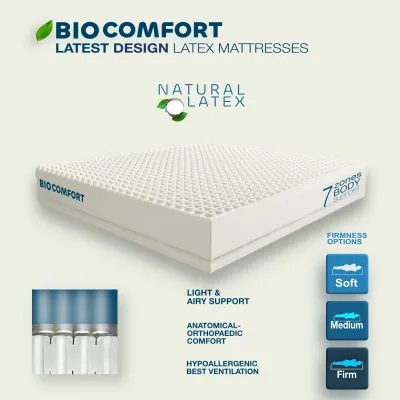Best HYPOALLERGENIC 100% Natural Latex mattress for more accurate support and airy comfort. Best adaptation. Innovation in design Best BREATHABLE. Cool in Summer - Warm in winter. • 100% Natural Latex (rubber) foam designed with 7 comfort zones. • The latex core is cast in a special matrix that shapes the upper layer of the solid core into capsules with different hole diameters. The core itself has breathable channels from end to end. • Bio Comfort comes in two versions: BIO COMFORT and BIO COMFORT DUAL.The difference is that Bio Comfort Dual offers dual comfort options and the ability to combine two firmness levels. Don’t confuse this mattress as soft – it has the same density as all latex mattresses, providing anatomical support and adapting to the body’s curves, absorbing weight for the most natural spinal health orthopedic comfort. With this mattress, you won’t sink but rather experience the most comfortable airy effect on its surface.